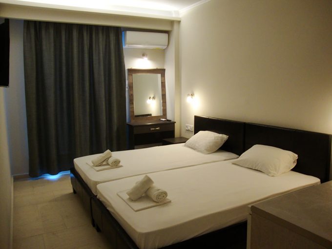 Sadržaj sobe: U ponudi imamo dvokrevetne i trokrevetne studije koji se nalaze u prizemlju, prvom, drugom i trećem spratu. Svi studiji opremljeni su čajnom kuhinjom ( posuđe i mini električni šporet) namenjenu za pripremu lakih obroka, kupatilom, klimom koja se doplaćuje 5eur dnevno, Wi-Fi internet i TV-om.