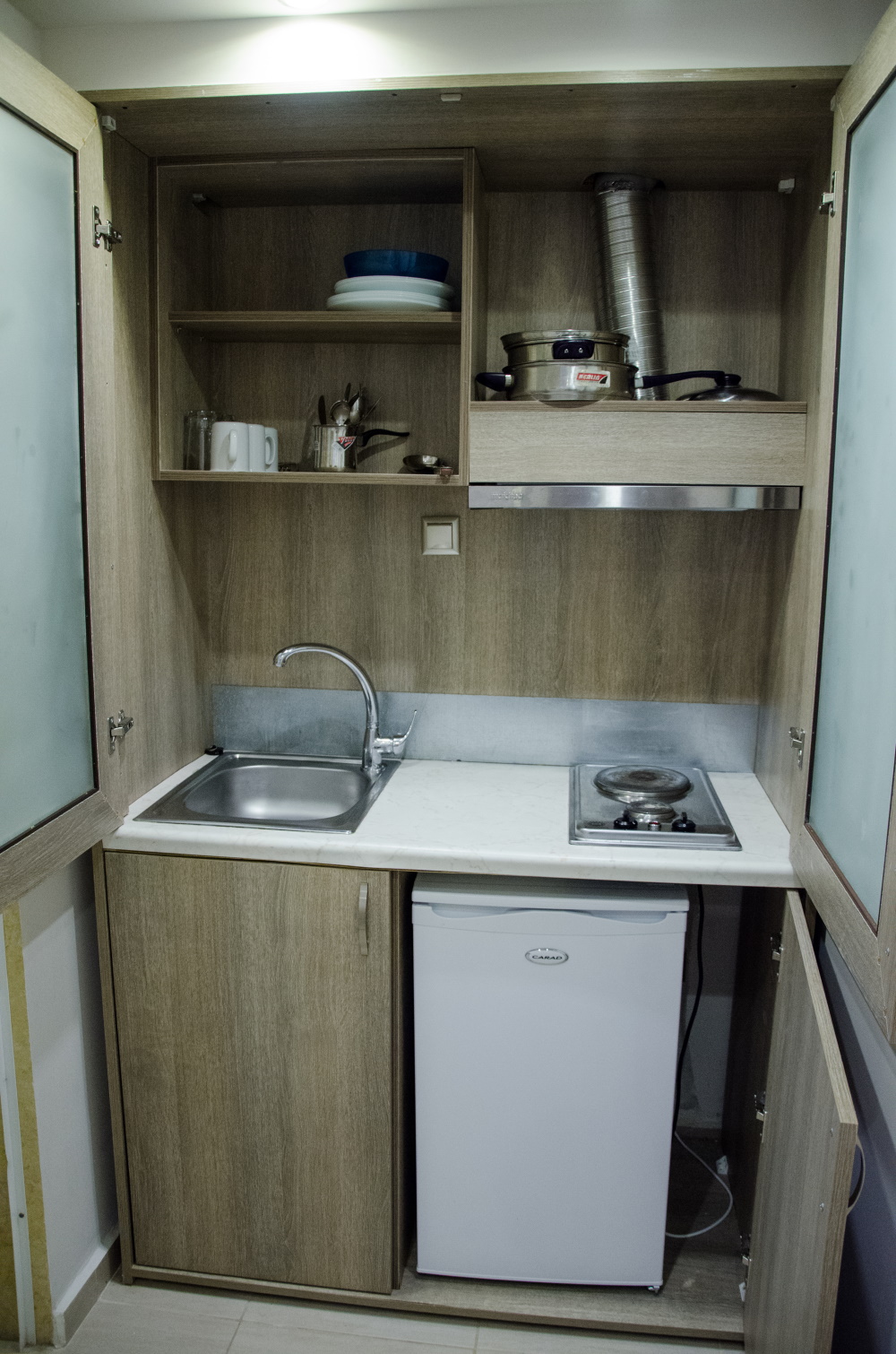 DVOKREVETNI STUDIO: Sastoji se od dva standard ležaja ili francuskog ležaja dimenzija (160X200cm), ormara, noćnog stočića sa ogledalom, TV/KAT, klima uređaja, jednog velikog i jednog malog peškira po osobi. Kuhinja je u potpunosti opremljena posuđem za dve osobe, aspiratorom, šporetom sa dve ringle i frižiderom. Kupatilo je sa tuš kabinom, fenom za kosu. Svaki studio poseduje terasu sa stolom i dve stolice.
